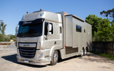 A construção do motorhome aproveitou os oito metros de comprimento do chassi e criou um layout que integra a cabine ao ambiente interno, algo pouco comum em adaptações desse porte ...